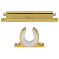 The Lee's Tackle Shimano Tiagra 130 Rod & Reel Hanger Set is constructed from marine-grade anodised aluminium in bright gold colour. The reel is attached to the hanger using the bracket with inbuilt spring-loaded pins, which snap into the harness lugs on top of the reel. The reel cannot move once it is secured. The tip of the rod is placed into the locking end of the rod ring featuring a nylon ring. The ring is rotated to lock the tip of the fishing rod into place. The Rod & Reel Hanger Set can be mounted in a horizontal, vertical or overhead position. This set is designed for the Shimano Tiagra 130 and is available in bright gold only.