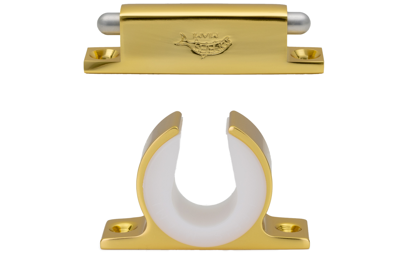 The tip of the rod is placed into the locking end of the rod ring featuring a nylon ring. The ring is rotated to lock the tip of the fishing rod into place. The Rod & Reel Hanger Set can be mounted in a horizontal, vertical or overhead position. This set is designed for the Shimano TLD 25 / TLD 30 and is available in bright gold only.